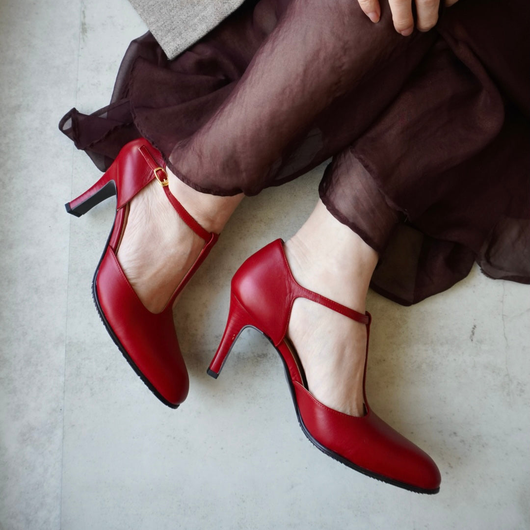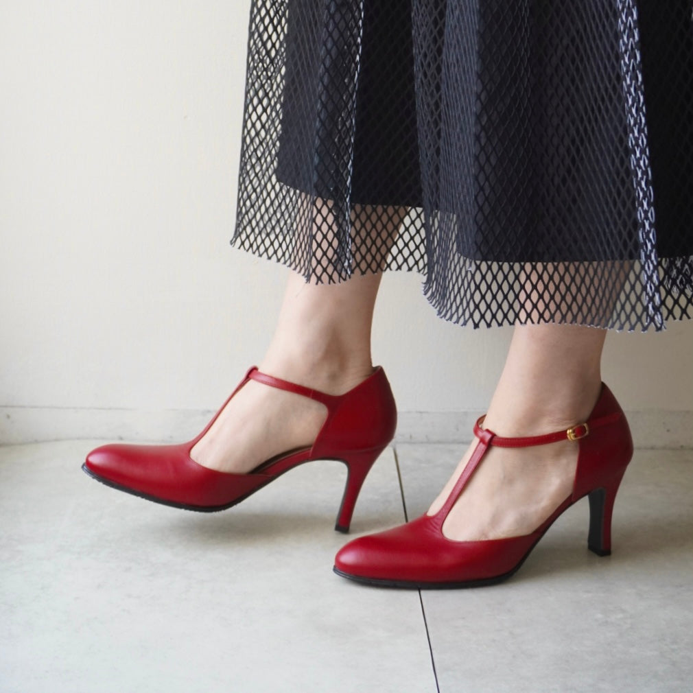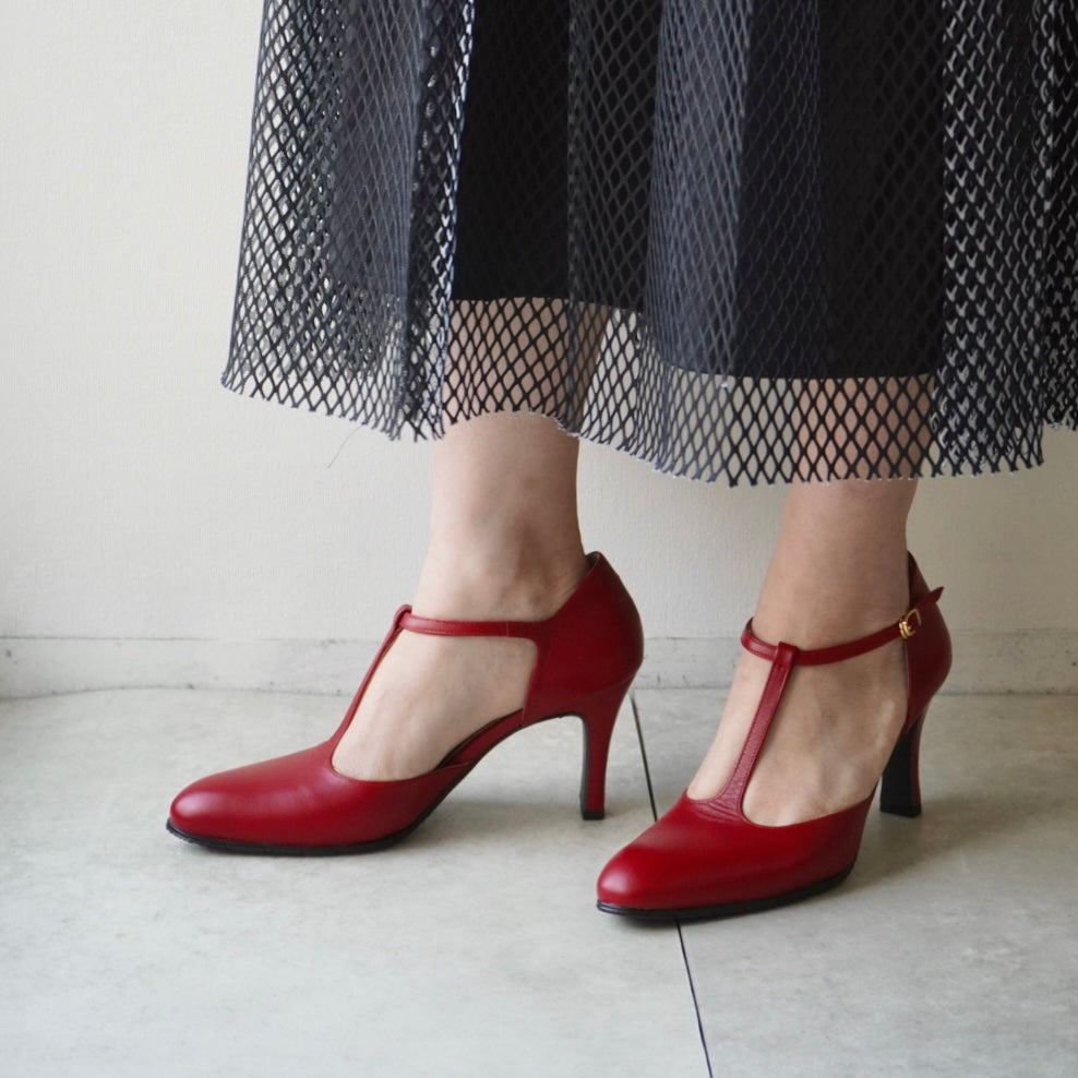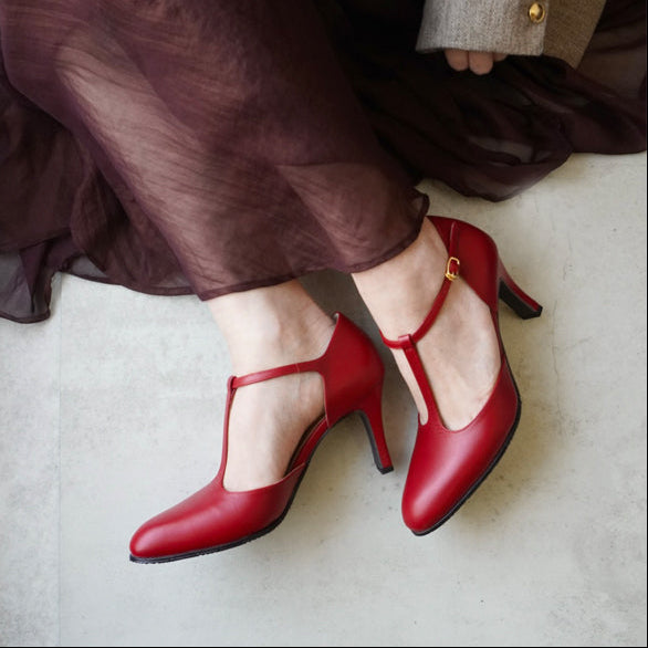 華奢なシルエットの美しさとTストラップで足を留める安定感が魅力のパンプス。