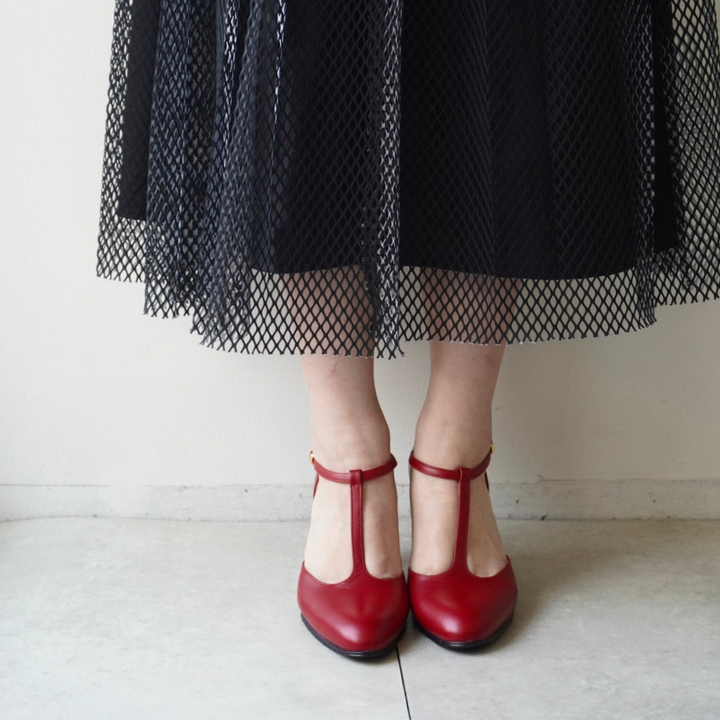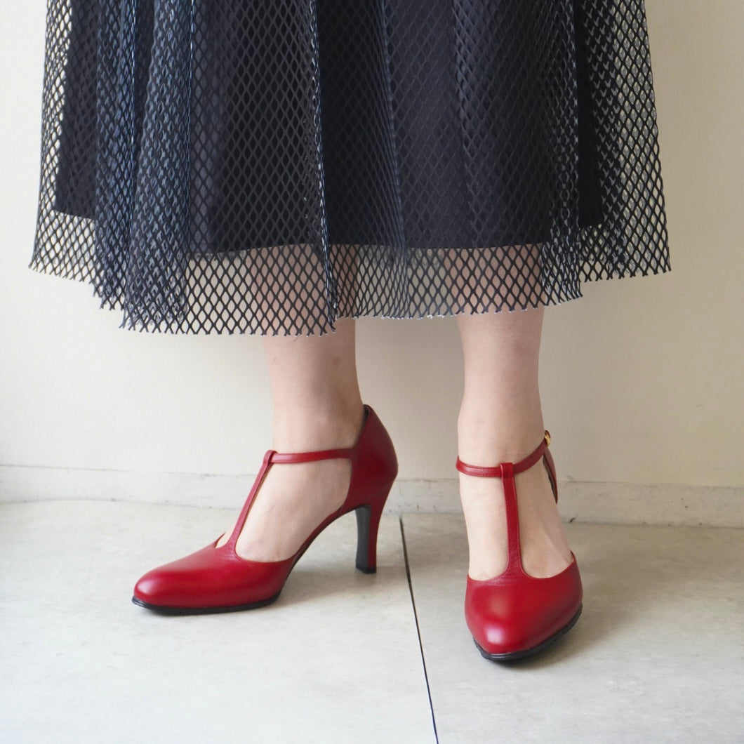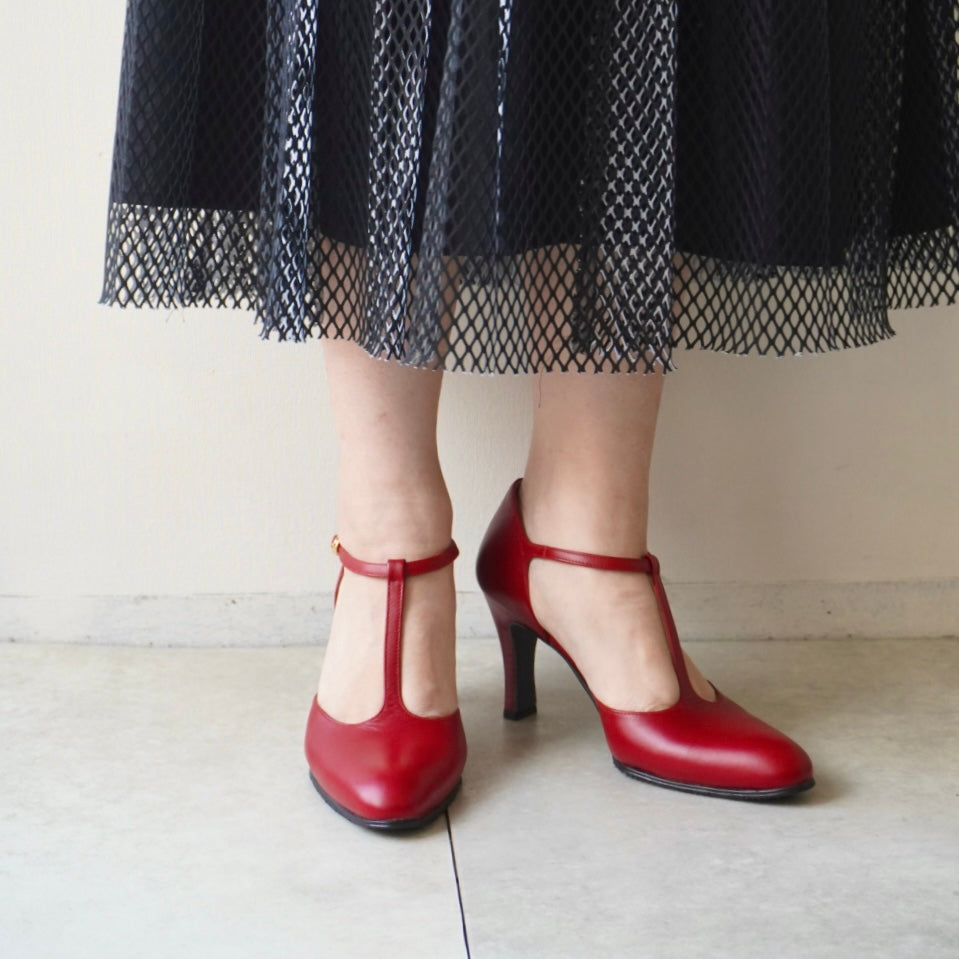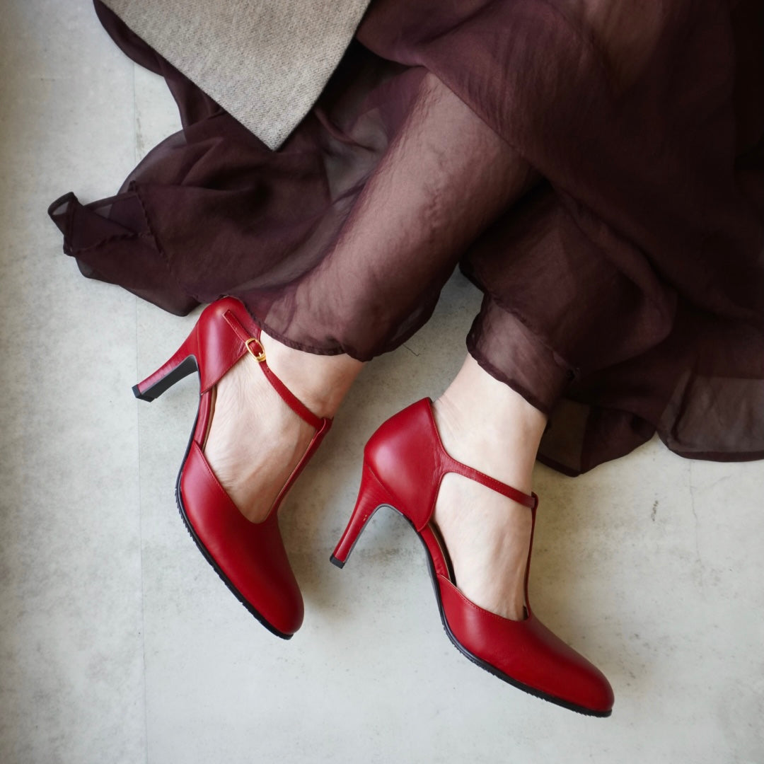 華奢なシルエットの美しさとTストラップで足を留める安定感が魅力のパンプス。
