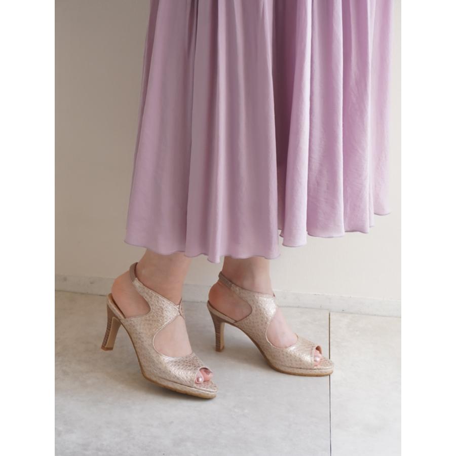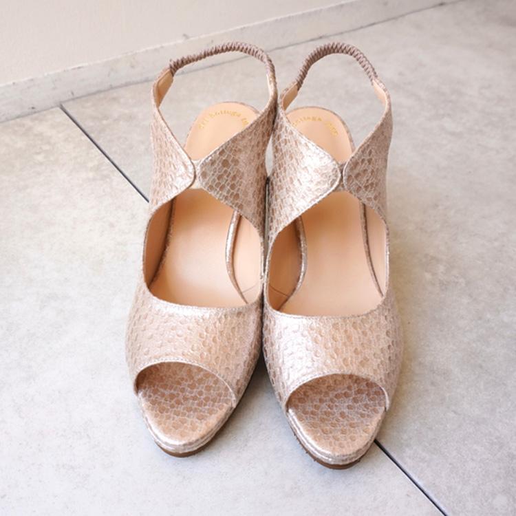 シャンパンゴールドは柔らかいゴートレザーで履きやすく、足元で煌めく光沢感が華やかなサンダルです。