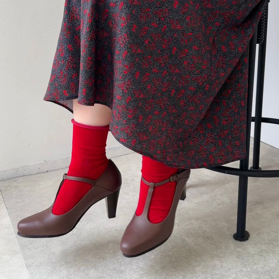 暖かい時期には素足やストッキングで、寒い時期にはカラータイツやソックスで合わせても馴染む、年間を通してお使い頂けるパンプスです。