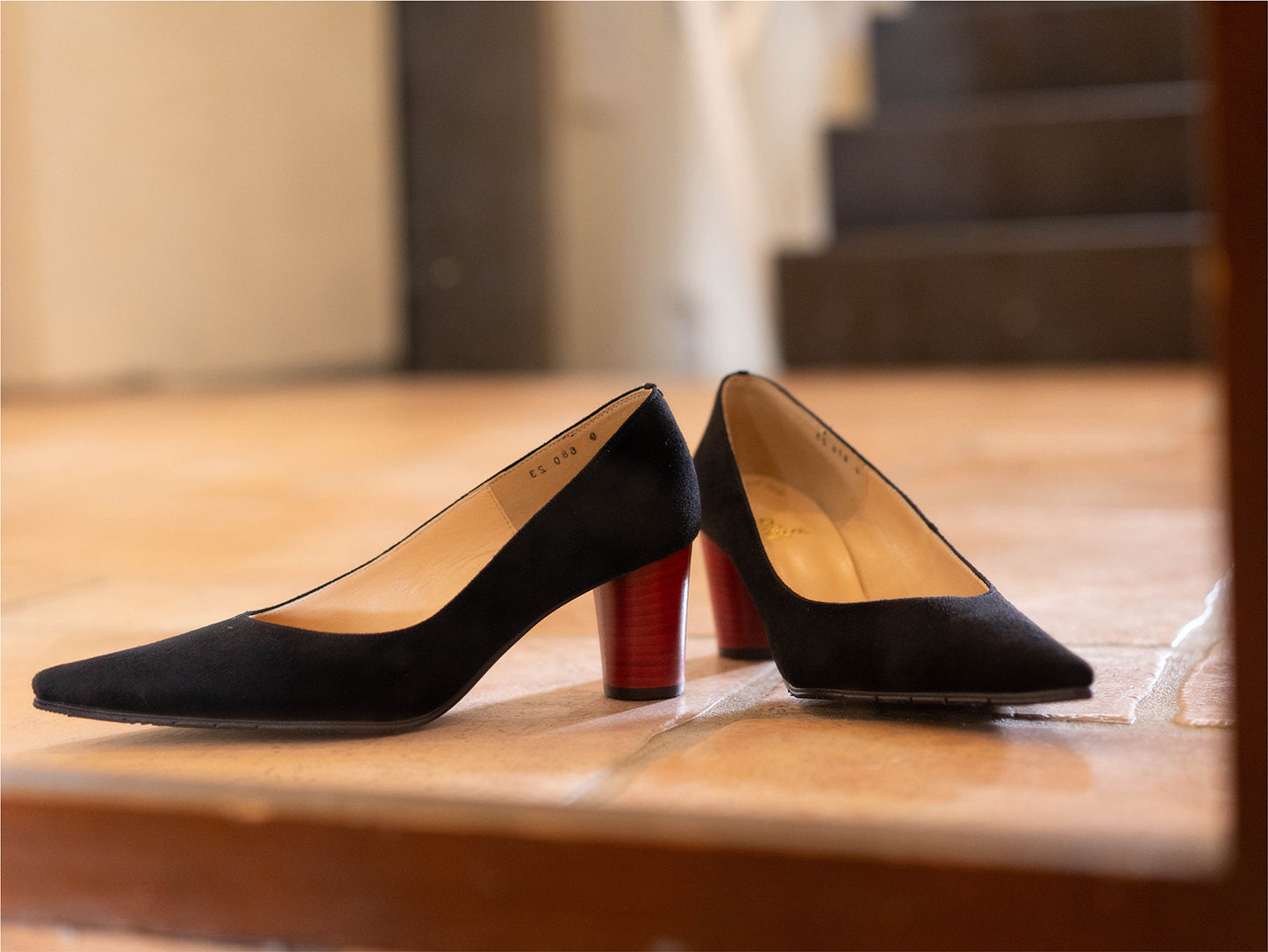 斜めカットが美しい定番プレーンパンプスを、深いブラックのスエード×赤のヒールで印象的に仕上げました。