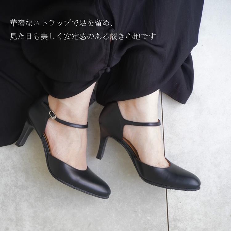 履き口浅めのパンプスが苦手な方にも、ストラップがしっかりと足をホールドしてくれるので安心です。