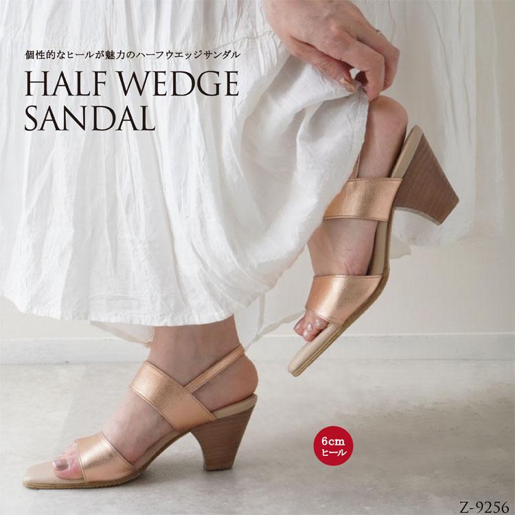 個性的なハーフウエッジヒールが魅力のシンプルストラップサンダル。