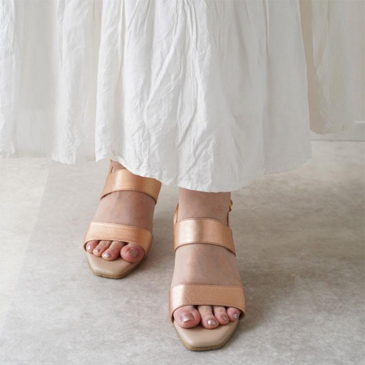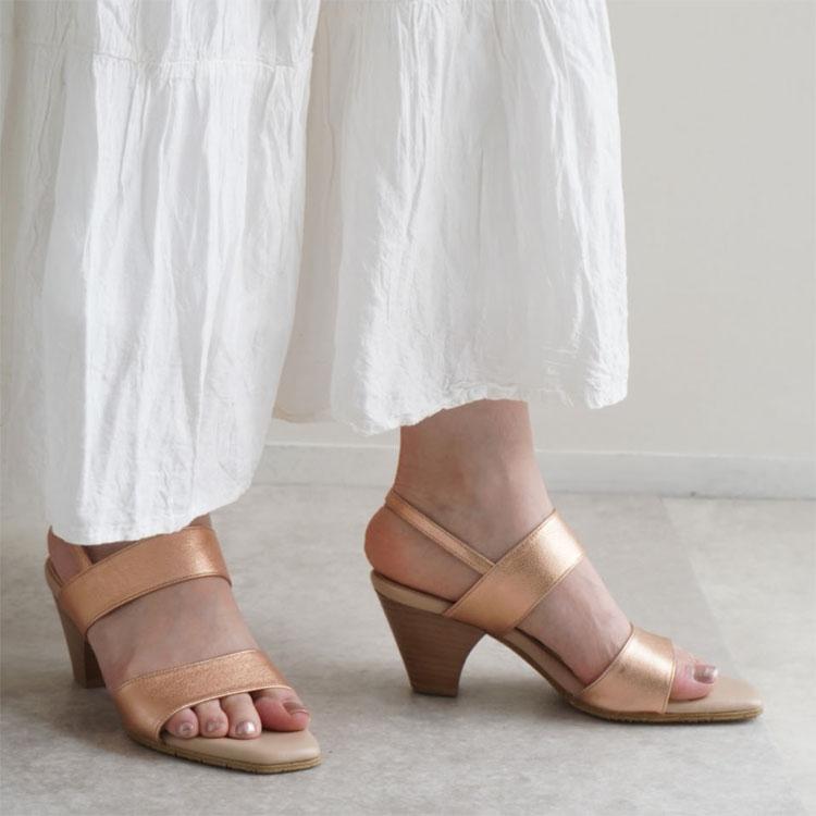 シンプルなデザインにメタリック素材で華やかさをプラス。さりげない光沢感が足元を引き立てます。